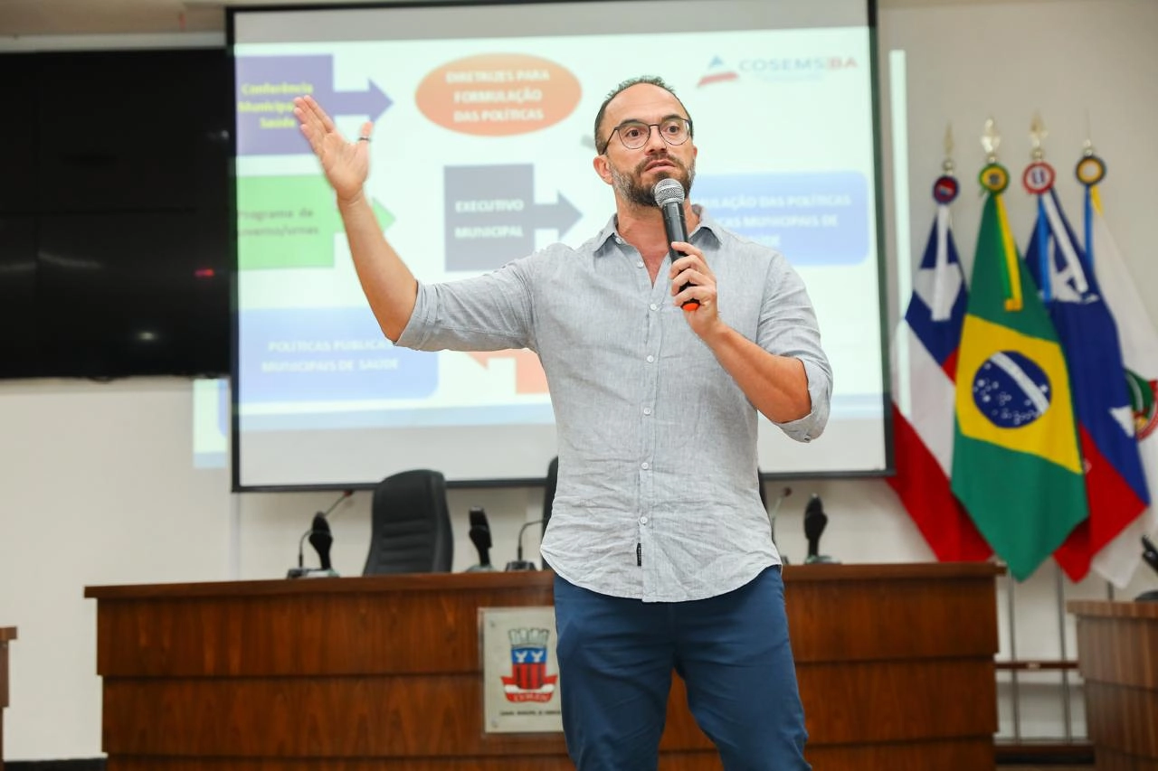 Manoel Henrique, coordenador do apoio institucional do COSEMS - BA, mediou a palestra destacando o futuro das políticas públicas de saúde, a partir da elaboração do plano municipal para o quadriênio 2026-2029.