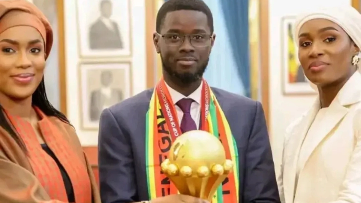 Nas imagens é possível ver-se Bassirou Diomaye Faye sorridente a agarrar o troféu, conquistado há dias pelo seu país, em conjunto com as duas esposas.