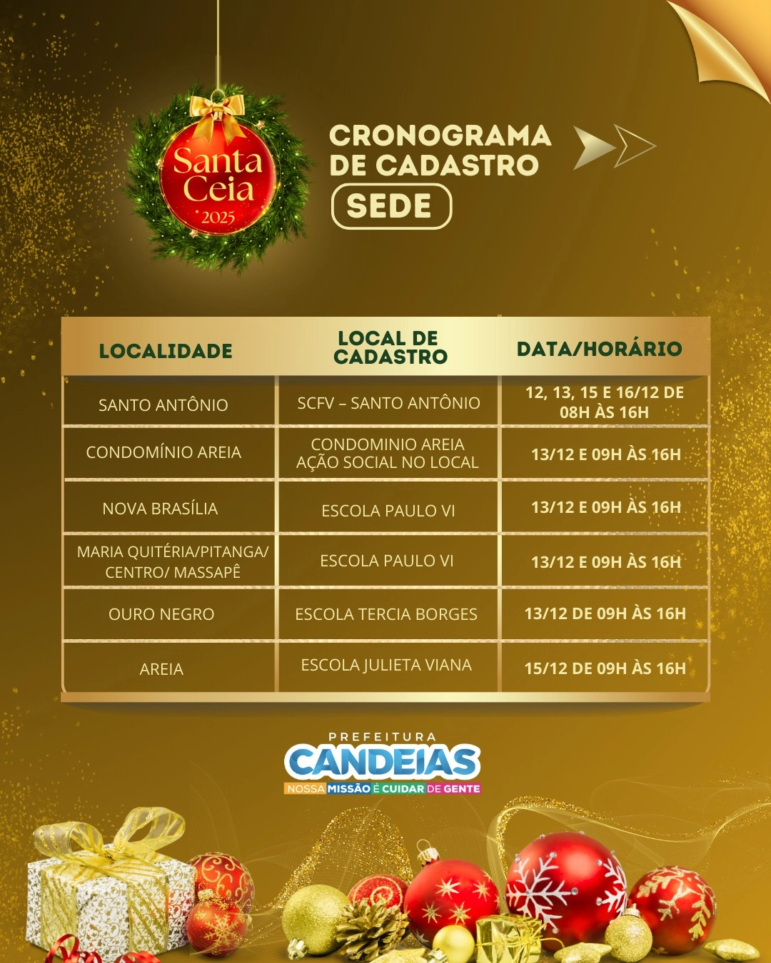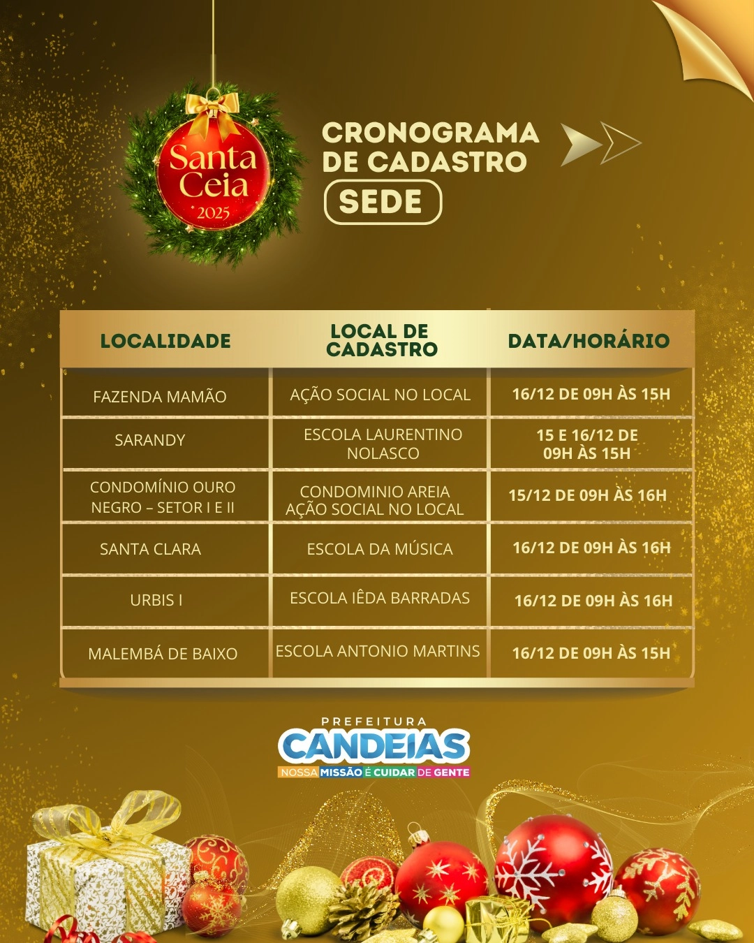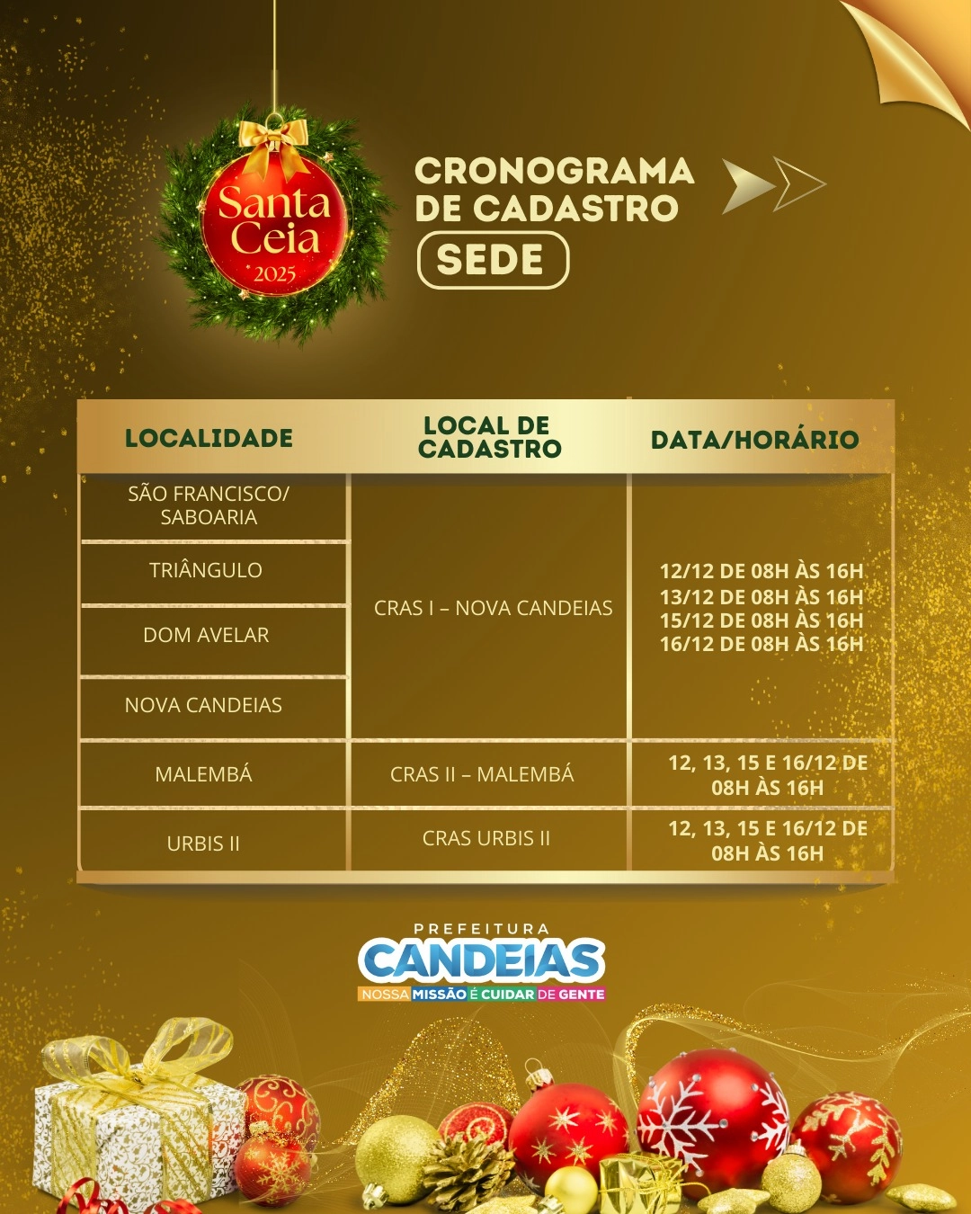 A Prefeitura, por meio da Secretaria de Promoção Social e Combate à Pobreza (SEMPS), divulgou nesta quinta-feira (11) o cronograma de entrega dos tickets da Santa Ceia.