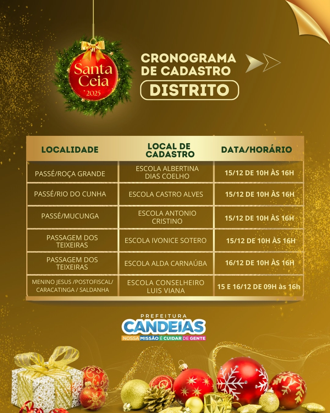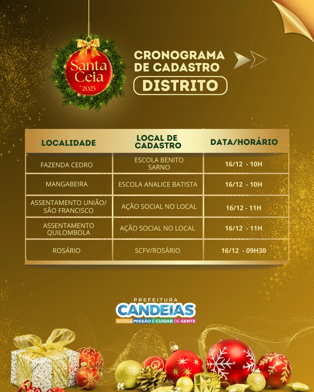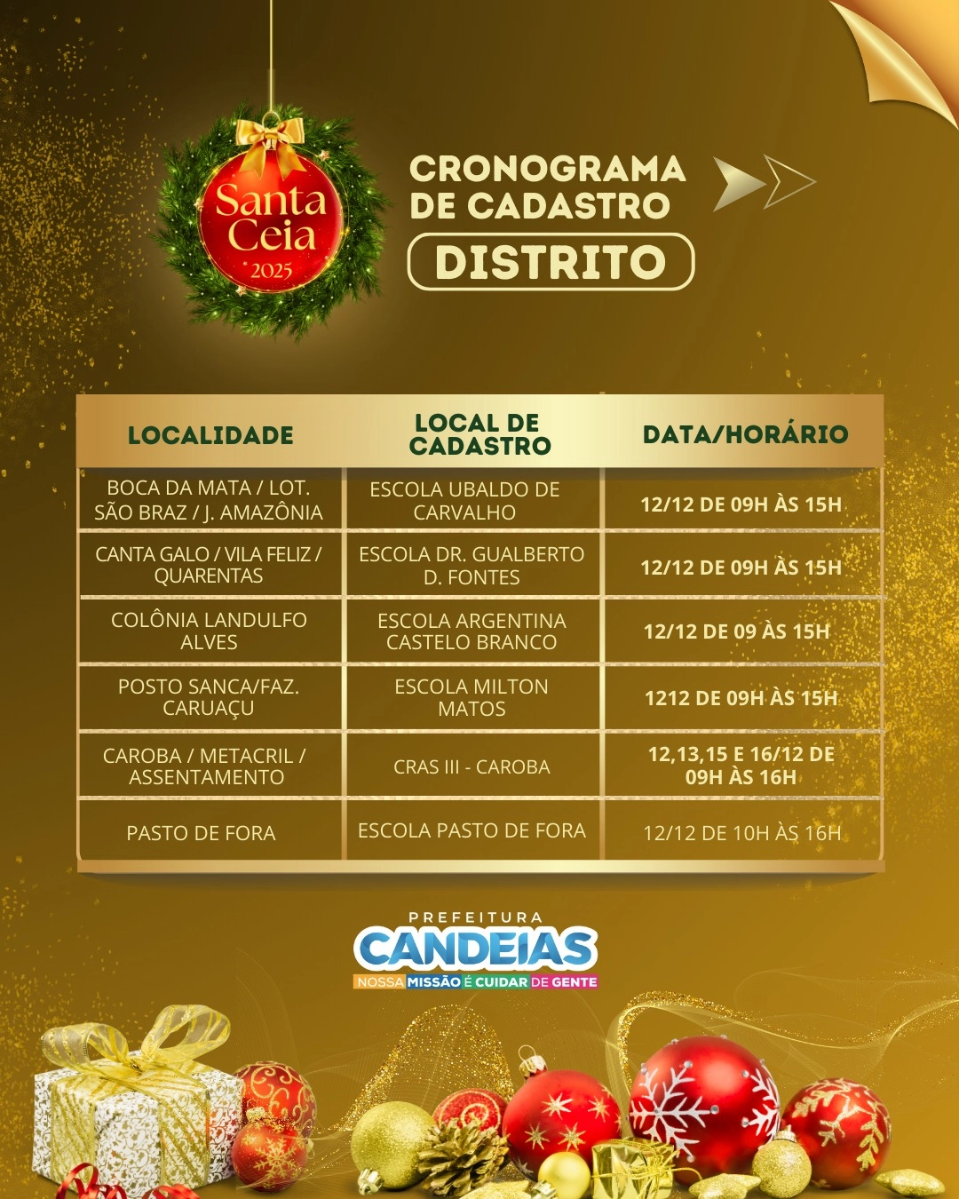 A Prefeitura, por meio da Secretaria de Promoção Social e Combate à Pobreza (SEMPS), divulgou nesta quinta-feira (11) o cronograma de entrega dos tickets da Santa Ceia.