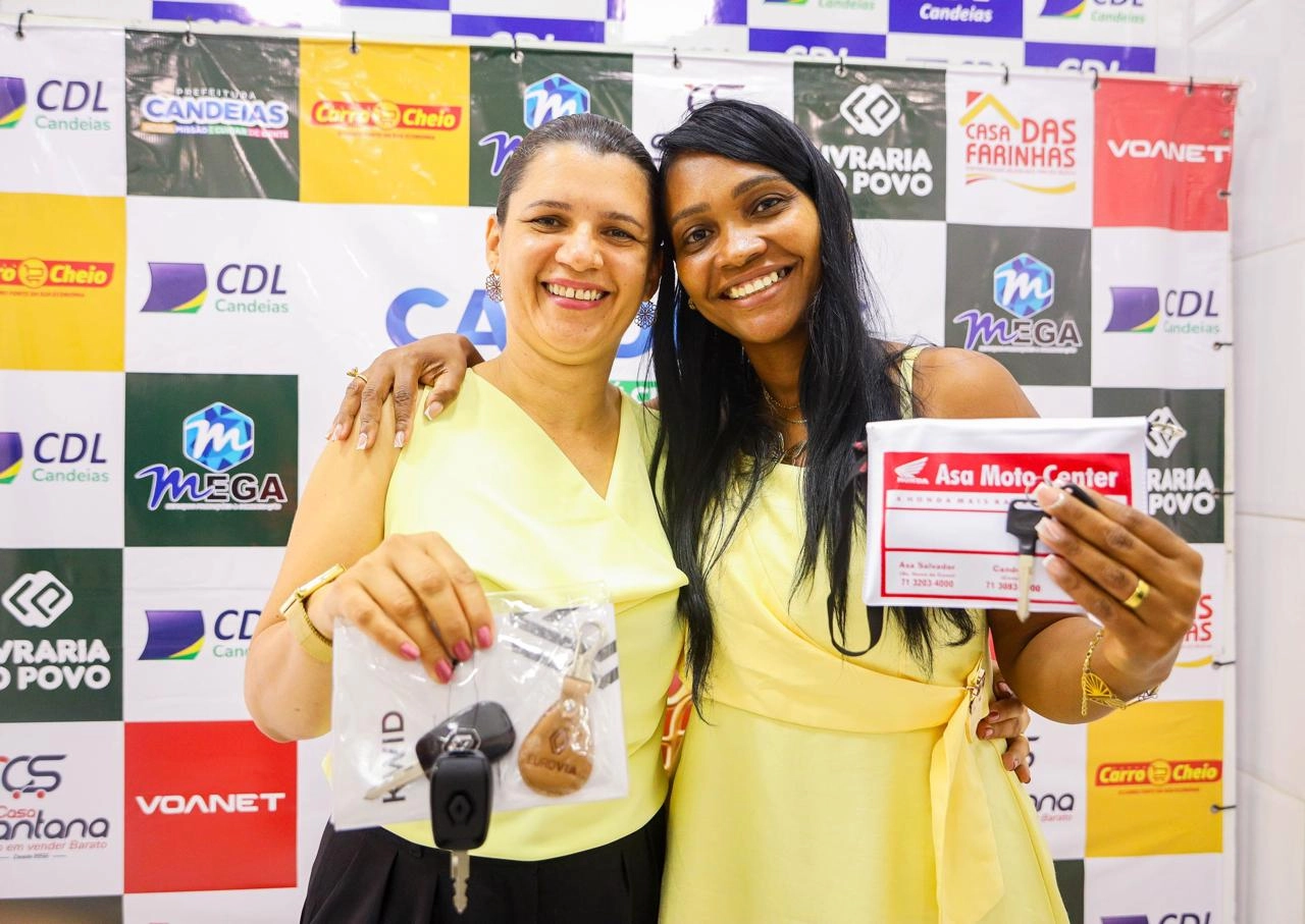 Na manhã desta terça-feira (20), o prefeito do município de Candeias, Eriton Ramos, e a diretoria da Câmara dos Dirigentes Lojistas de Candeias (CDL), na pessoa da presidente Marivete Machado, entregaram as chaves dos veículos às ganhadoras da campanha Natal de Luz 2025.