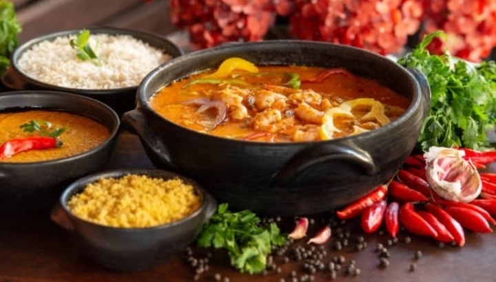 Moqueca Baiana: Peixe ou camarão cozido lentamente com tomate, cebola, coentro e azeite de dendê.